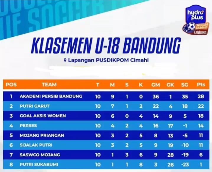 Posisi puncak klasemen saat ini masih ditempati Akademi Persib Bandung dengan 28 poin, namun Putri Garut terus memberikan tekanan dan berpotensi memperkecil jarak di sisa pertandingan.